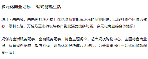 珠江未来城项目是莲花湾片区唯一一座具有醇熟商业配套的百万方大城,项目自身配套BLOCK商业街区, 规划有旗舰店、书吧、主题咖啡、艺术馆、主题餐饮、临池别馆、展示中心、滨水会客厅、国际幼托等多元业态;