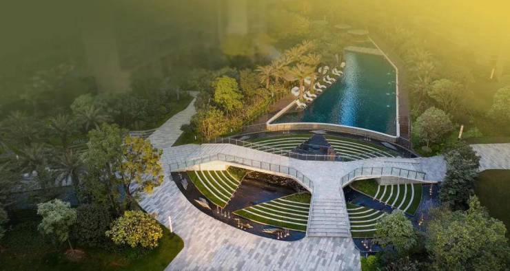 园区结合现代东南亚设计风格,将生态都会雨林湾融入到园林中,双桥(雨林桥、雨水桥)规划,碧水湾溪约2000m²泳池设计,棕榈迎宾,于繁华里享静谧生活。