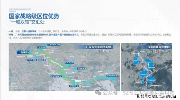 双轴:广深科创走廊创新轴-研发创新节点和深圳最强科创中轴-制造创新节点,东起深圳国际生物谷,西至广州琶洲互联网创新集聚区、南联深圳科技园和后海商务区,北接松山湖,肩负共筑“创新脊梁”的重要使命。