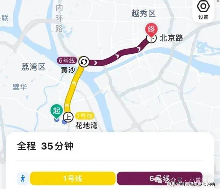 地铁去往北京路:项目步行至地铁口,坐1号线地铁至黄沙换乘6号线,共6站到达越秀区北京路,全程耗时35分钟。