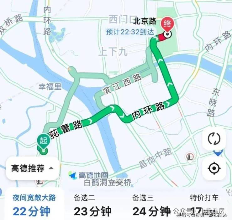 自驾去北京路:出小区上花蕾路转洲头咀隧道,再上内环至江南大道,全程8.4公里,耗时22分钟,这是不堵车的情况下,上下班内环会堵车,通勤时间会拉长。