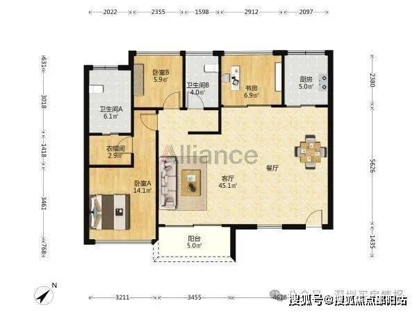 该户型朝西南和东南,南北透通,带两个阳台,餐厅和入户都可拓展,书房可改4房,不足之处在于玄关、过道处有点浪费面积。