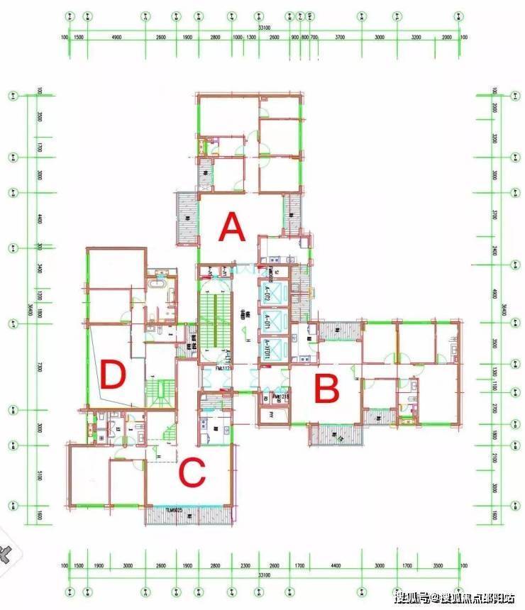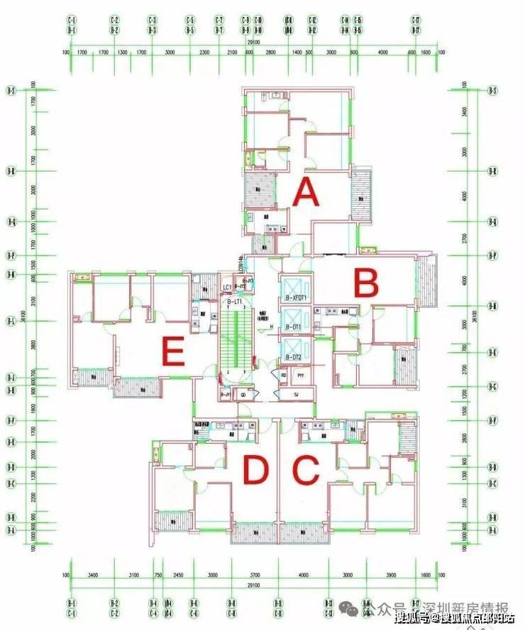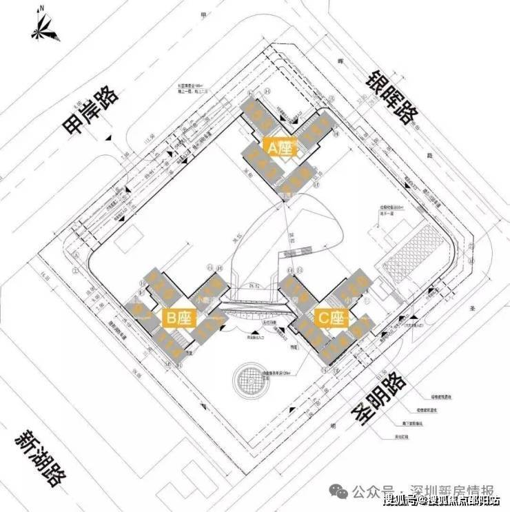 项目三栋住宅均为塔楼设计,A座三梯四户,B座、C座均为三梯五户,各栋户型分布平面图如下: