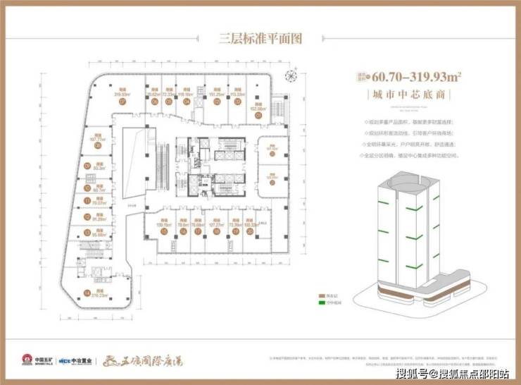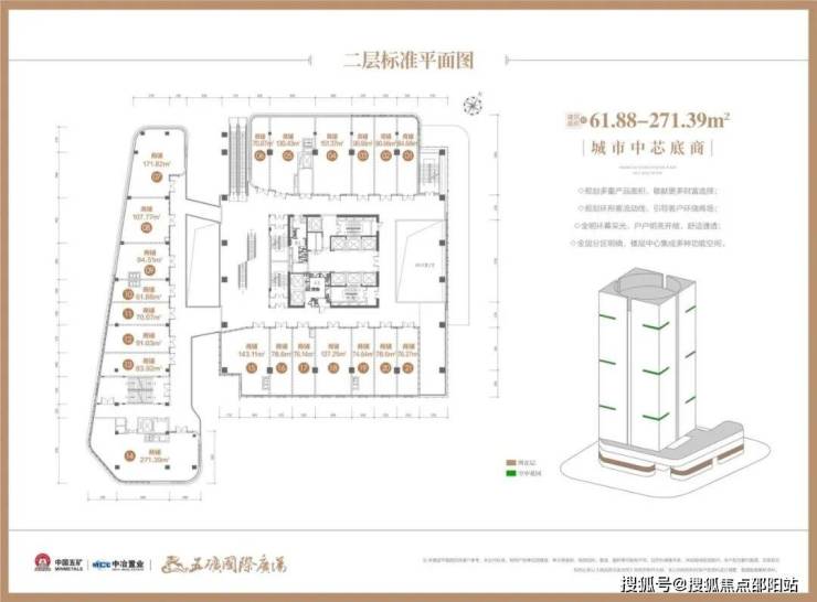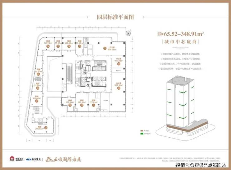 【楼栋概况】楼体高度110米,地下二层地上22层,1-4层为城市中芯底商,首层层高约6米、2层层高约为4.5米、3/4层层高约为4.35米;5至18层为国际商务空间,层高约为4.2米。