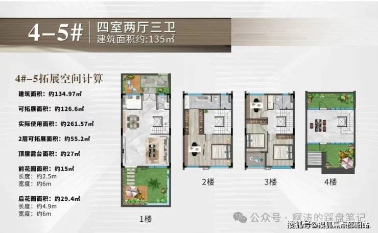 可拓展空间极大,可实现3+1层高拓空间,以4-5#为例,建筑面积约134.97㎡,总拓展约126.6㎡(其中室内约55.2㎡、前后花园约45㎡、顶楼露台约27㎡),实得率194%。