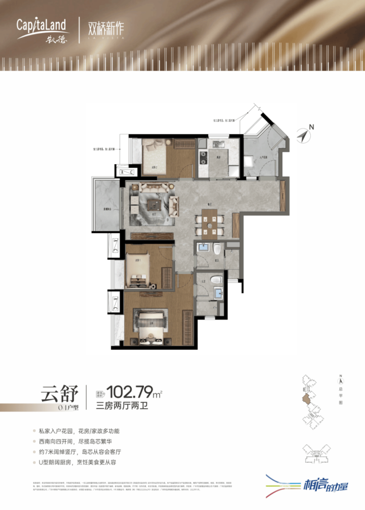双桥新作规划三栋住宅,共411套精品住宅,户型涵盖74-128㎡二至四房,多样化的户型产品满足不同客户需求,同时打造层次丰富的园林景观,配置全龄活动空间,全新概念的空中跑道。