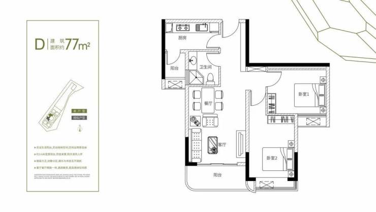 建筑面积约76-78㎡2房+1卫(灵活多变+1多功能空间)