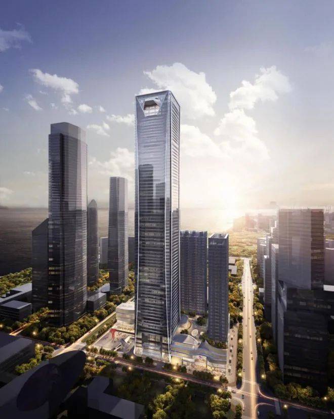项目主塔楼幕墙高度358.7米,集甲级办公、高端办公、五星级酒店、临海观景台、城市会客厅、天际观景台等业态于一体,形成多元复合的摩天都会。