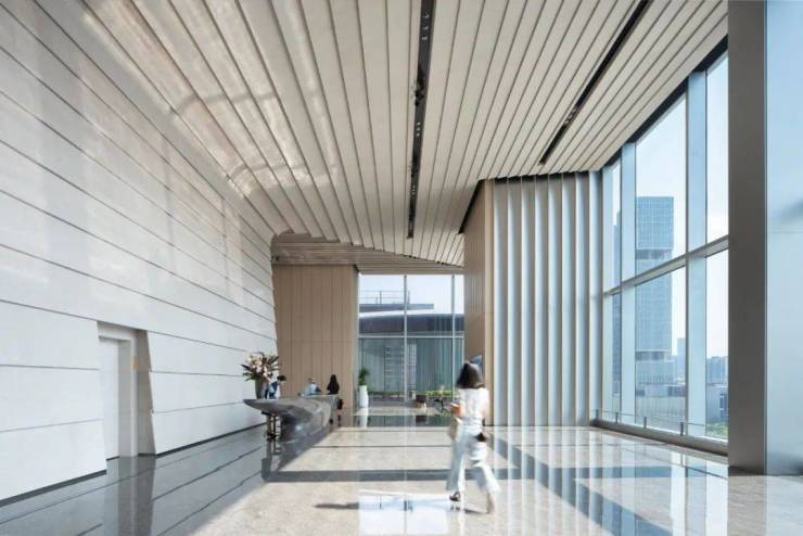 设计将主办公大堂设置在五层,通过穿梭电梯把办公人群提升至五层再进行各区人员分流,减少首层办公大堂需求面积,提升大堂的景观视野和品质。同时,办公大堂与商业屋顶紧密联系,不仅为办公人群提供了便捷的休憩空间,也拉动了高楼层商业的人流,实现不同业态的共赢。