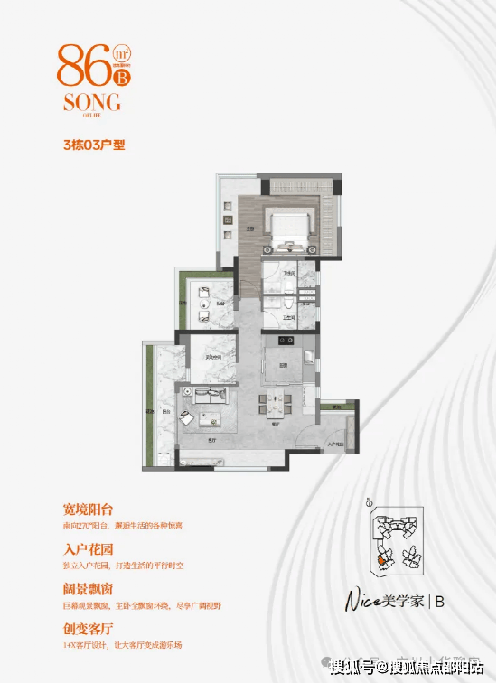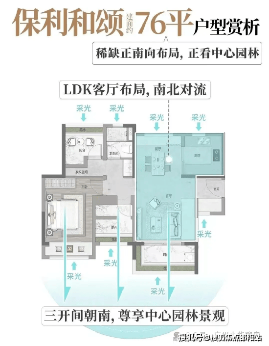 ▪南北对流 ,三开间朝南望中心花园,1+X客厅设计,客厅开间约3.8米
