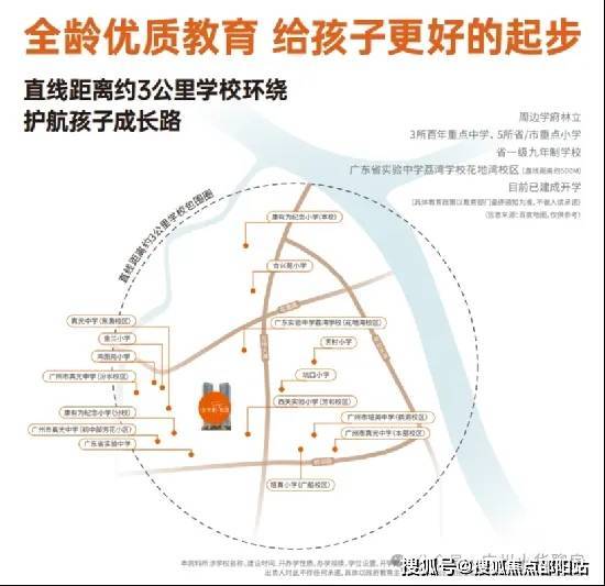项目自身配建了一所9班幼儿园,花地湾省实学校直线距离,周边还有真光中学、康有为小学、培英中学等名校