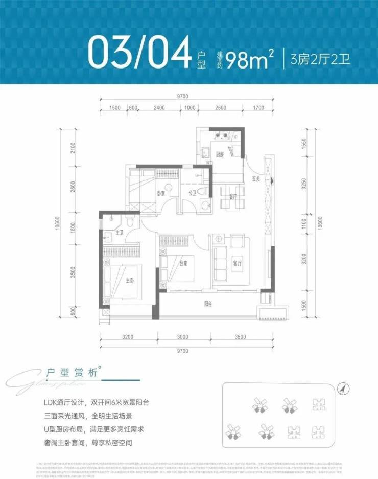 传统竖厅格局,动静分区,客厅开间约3.5米,主卧开间约3.2米,两个次卧开间约3米、约2.6米,约6.5米大阳台连接客厅和次卧;03户型西南户型,04户型东南朝向。