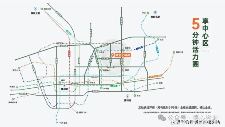 近享福田成熟交通配套,4地铁线环绕(地铁6、7、9号线,另有规划24号线),畅达全城。3口岸、5高铁站,多条城市主干道,全维交通路网,多方式通达全城与香港,打造湾区半小时生活圈,深港双城无缝衔接。
