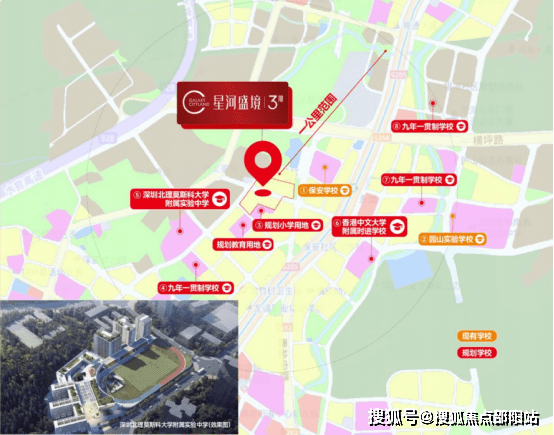 此外,星河盛境3期南侧规划有小学教育用地,片区内还规划4宗九年一贯制教育用地,其中,有一所拟定为香港中文大学附属时进学校。(具体入学以当年区教育局公示为准)