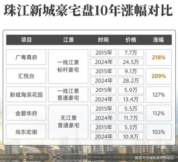 像同在珠江新城东区,占据一线江景的标杆顶豪盘,不仅总价更高,涨幅也远远甩开其它没有江景或者品质一般的豪宅盘。