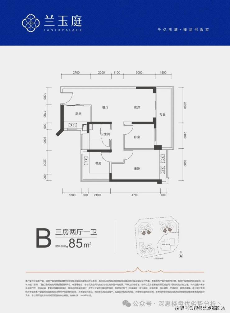 85㎡的3房2厅1卫,B户型,设计的是竖厅格局,客厅开间3.3米,LDKB一体化,三开间朝南,3个卧室分别做到了主卧13.3㎡/次卧7.06㎡/次卧6.37㎡(套内实测),客厅连接次卧出5.7米长的大阳台,L型厨房,创新式三分离卫生间,得房率:79.8%(不含赠送),西南或东南朝向。