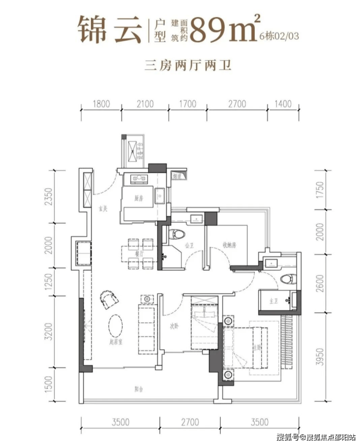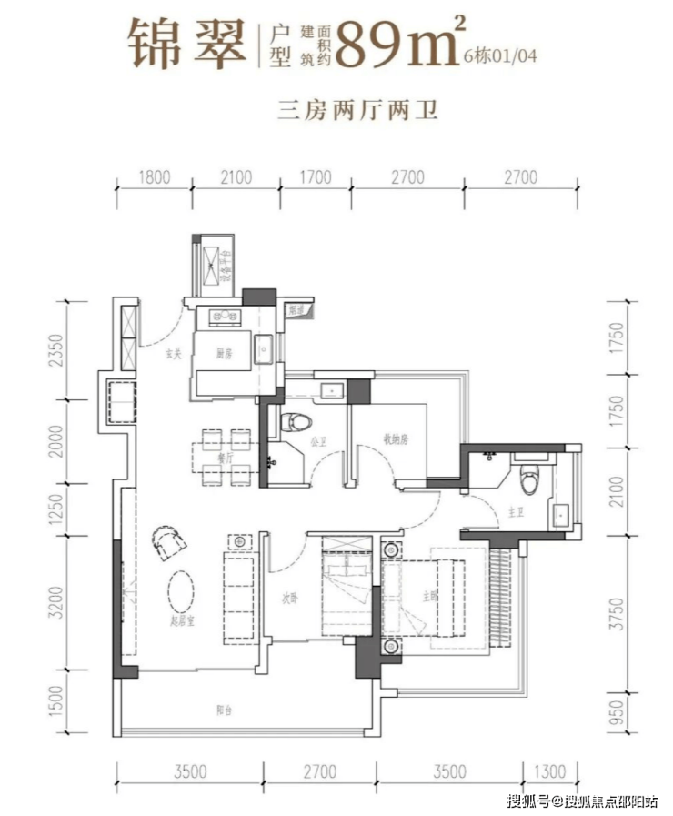 89㎡3房2厅2卫,6栋01/04以及02/03(主卫差异)竖厅户型,客厅3.5米开间,LDKB一体化,S墙设计预留冰箱卡槽位,三开间朝南,主卧+次卧270°无柱转角飘窗,主卧15.25㎡、次卧7.56㎡、次卧6.48㎡(包含墙体飘窗),客厅连接次卧出大阳台约11.46㎡,赠送后得房率约97%,西南或东南朝向。