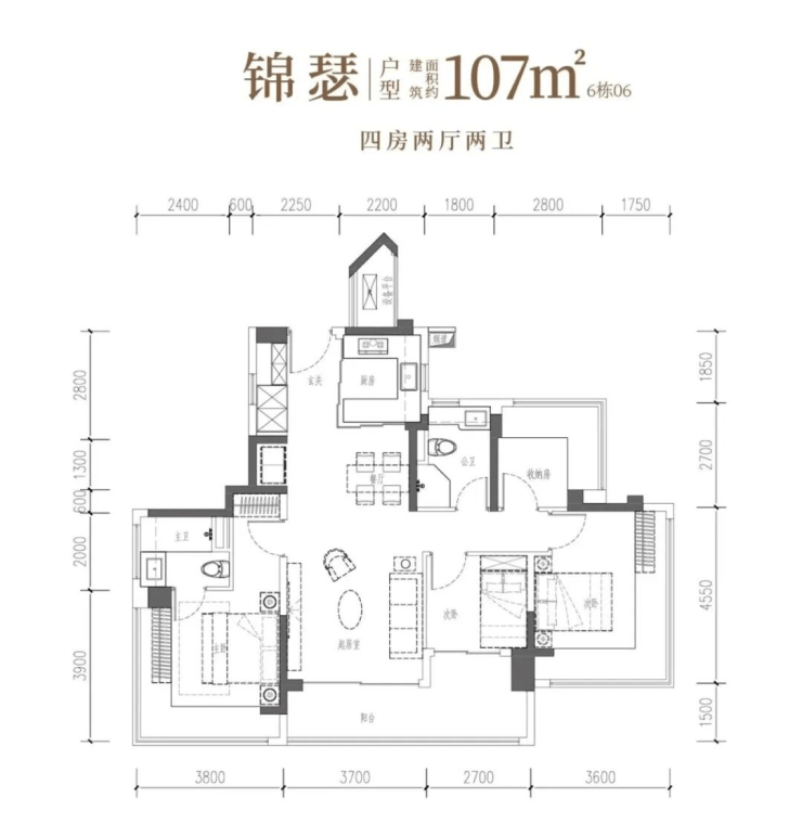 107㎡4房2厅2卫,双龙抱珠格局,客厅3.7米开间,LDKB一体化设计,预留冰箱卡槽位,四开间朝南,主卧+2个次卧270°无柱转角飘窗,主卧17.94㎡、次卧16.38㎡、次卧7.56㎡、次卧6.89㎡(包含墙体飘窗),U型厨房烟道外置,赠送后得房率约105%,东北朝向。