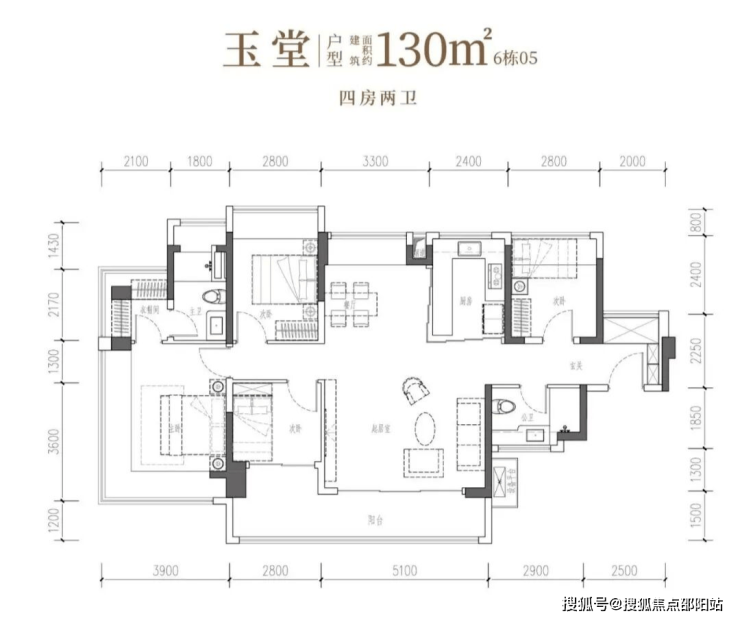130㎡4房2厅2卫,南北通透格局,进门独立玄关,客厅5.1米开间,主卧270°无柱转角飘窗+衣帽间,主卧23.66㎡、次卧11.2㎡、次卧8.96㎡、次卧7.84㎡(包含墙体飘窗),U型厨房烟道外置,赠送后得房率约101%,东北朝向。