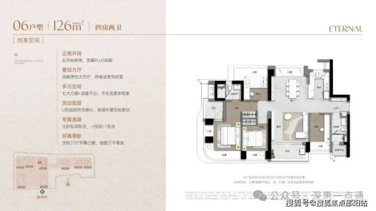 126m²的4房2厅2卫,设计的是竖厅南北通透格局,客厅3.9米开间,客餐厅分离化设计,五开间朝南,主卧套房270°环幕凸窗+私享阳台,七大凸窗+设备平台,分别做到了主卧20.23㎡/次卧9.92㎡/次卧9.3㎡/次卧8.77㎡(实测面积,去掉墙体),U型厨房,卫生间干湿分离,得房率超90%(包含赠送),正南朝向,看皇岗公园。
