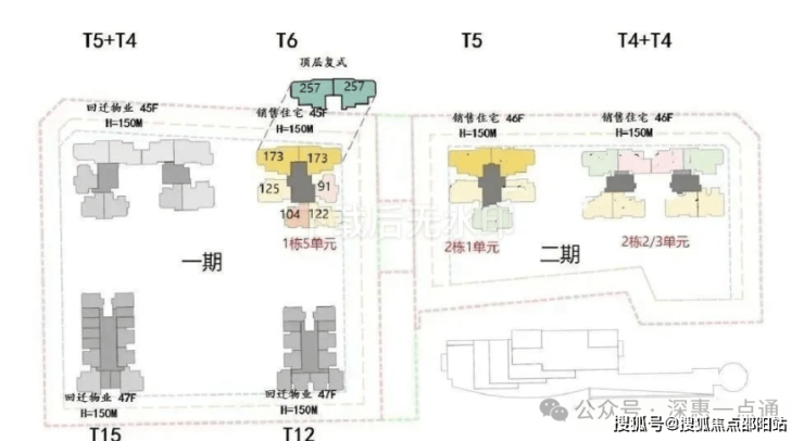 一期建设用地面积约3.1万平,总建面约22.5万平,容积率5.07,计容建面约15.9万平,一二期共用规划停车位1266辆。其中,住宅约10.2万平,商业约4.1万平(地上+地下)。5栋建筑,其中4栋为回迁物业。
