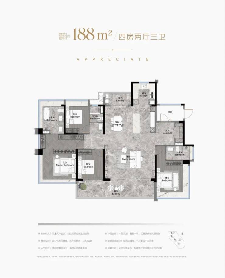 对主卧舒适度要求要求高的朋友,可重点关注188平,其有L型飘窗设计。
