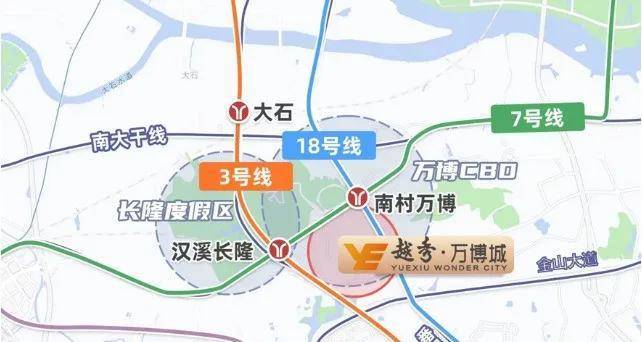 项目算是三地铁楼盘,最近的两条地铁线路分别是7号线以及18号线南村万博站,另外还有一条就是1.5公里的3号线汉溪长隆站,3号线比较远需公交或电瓶接驳。
