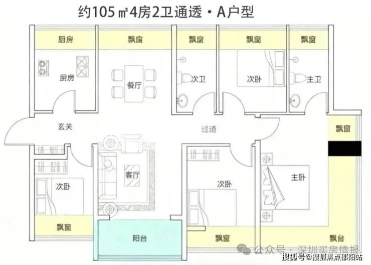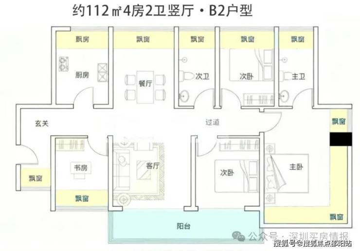 主力户型涵盖建面约105至188平方米的精装纯四房,全部为2梯4户或3梯3户的低密梯户比,通过大面积飘窗、阳台赠送实现了接近100%的实际使用率。户型设计上亮点纷呈——105平方米四房两厅两卫采用竖厅南北通透格局,四开间朝南,全屋十面飘窗,主卧配备270度无柱转角飘窗;112平方米户型提供横厅、竖厅及“双龙抱珠”三种格局选择;而楼王栋165至189平方米四房则为3梯3户专梯入户配置。