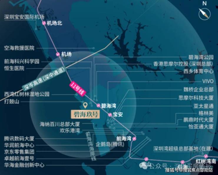 作为碧海片区容积率最低的新盘,项目容积率仅2.2,由7栋22-26层小高层住宅围合而成,总户数634套,全部为纯商品房,无回迁房、保障房配建,居住圈层高度纯粹。在交通出行方面,项目距离地铁11号线碧海湾站约570-650米,步行约8-10分钟即可进站,1站直达宝安机场、2站抵达前海湾、4站通达后海、6站直抵福田。