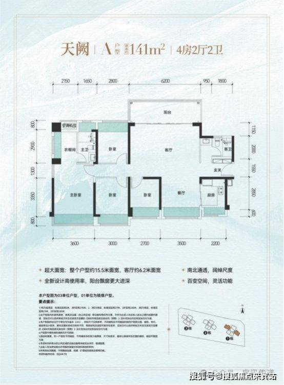 ◆超大面宽:整个户型约15.5米面宽,客厅约6.2米面宽