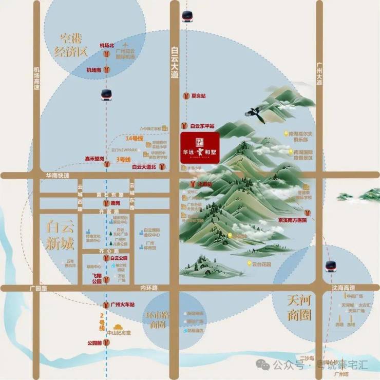 华远云和墅位于白云大道北白云山麓,距离14号线东平地铁站700米,是不可多得的低密纯别墅居住区。