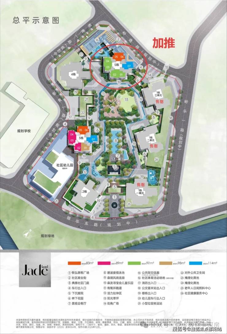 项目共由7栋48-49层高住宅组成,分为二期开发,一期为1栋1/2/3单元住宅48F,2栋住宅48F;二期为3住宅48F,4/5栋住宅49F;6栋是1所12班制幼儿园