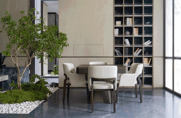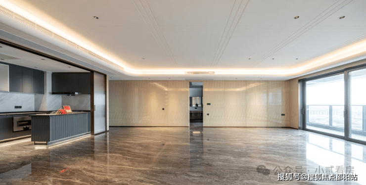 这种近乎奢侈的用材用料,被同步到了湖光悦色的室内交标中。除200平顶豪户型外,其余户型一律标配花纹连贯的岩板背景墙,同时,地面铺装、玻璃分隔,全部使用大块面切分。