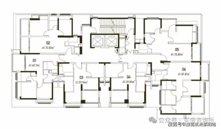 项目7-22层为住宅产品,可售商品房面积约59-89㎡ 2-3房,总房源共96套,2梯6户设计。