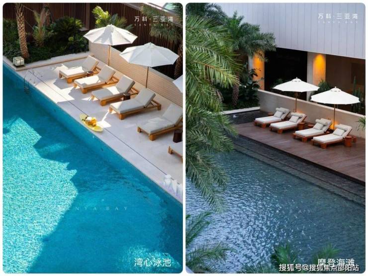 为了满足不同玩水场景和不同年龄段人群的需求,万科·三亚湾专门参照国际酒店高标,打造了度假双泳池,设置成年人和儿童分区,营造了极具松弛感的热带野奢氛围。摩登海滩营造了三面临水的岛屿浮台,让人能够沉浸放松;湾心泳池则利用高差,打造水岸吧台,带来具有层次感的度假体验。