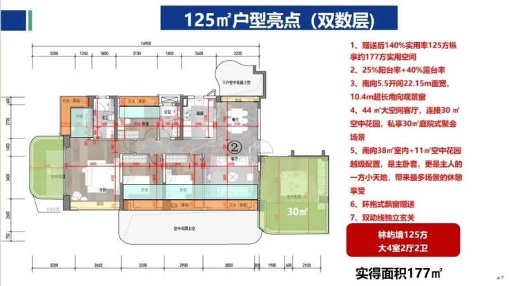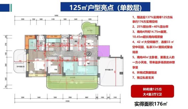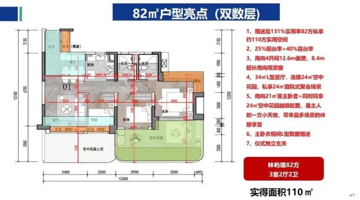 四代住宅的独特设计:招商林屿境是广州首个采用第四代住宅理念的项目,特别设计的空中花园与错层阳台,每户赠送的面积不计入产权,极大提升了空间利用率。比如,110㎡的户型通过赠送的空中花园,实际使用面积可达到158㎡,实用率高达141%。