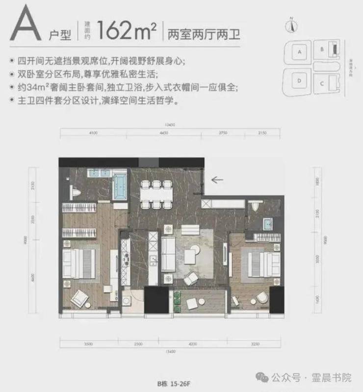 A户型:约162㎡2房2厅2卫:B栋15-26F(中区),东朝向