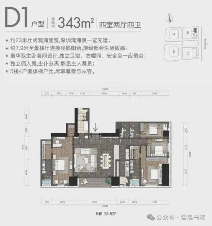 D2户型:约340㎡4房2厅4卫:B栋28-52F(高区),东朝向,户型与343㎡户型基本相同。