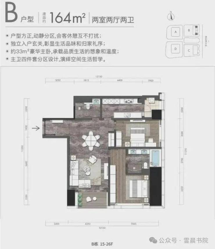 B户型:约164㎡2房2厅2卫:B栋15-26F(中区)端头户型,东朝向