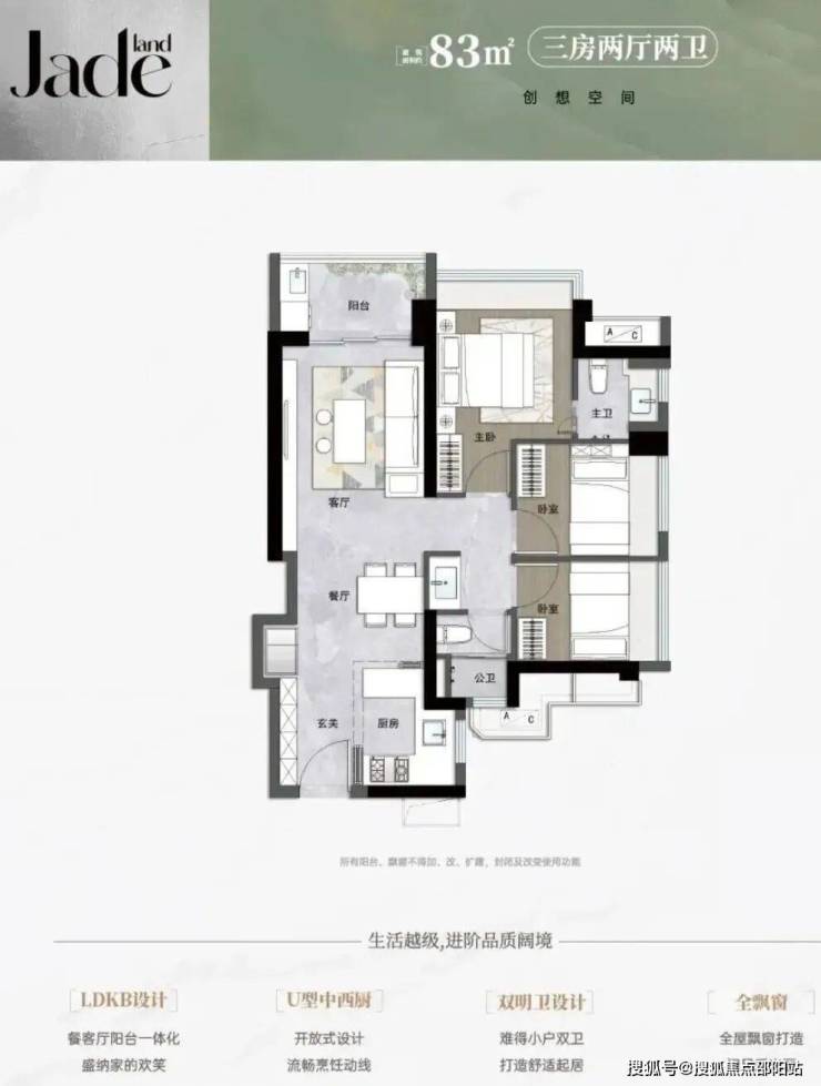 5栋83㎡的3房2厅1.5卫,设计的是竖厅格局,进门入户玄关,LDKB一体化,S墙设计预留冰箱卡槽位,U型厨房,主卫少了淋浴,公卫三段式分离,得房率约92%(包含赠送),阳台西北朝向。