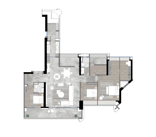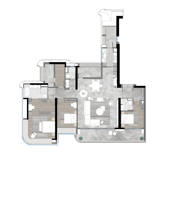 :电梯入户,电梯厅面积约 18㎡。五开间南向布局,客厅设 270° 环江巨幕景观阳台。三套房配置,超大 L 型望江主卧,全房间赠送飘窗花池,拓展空间且保证通透。