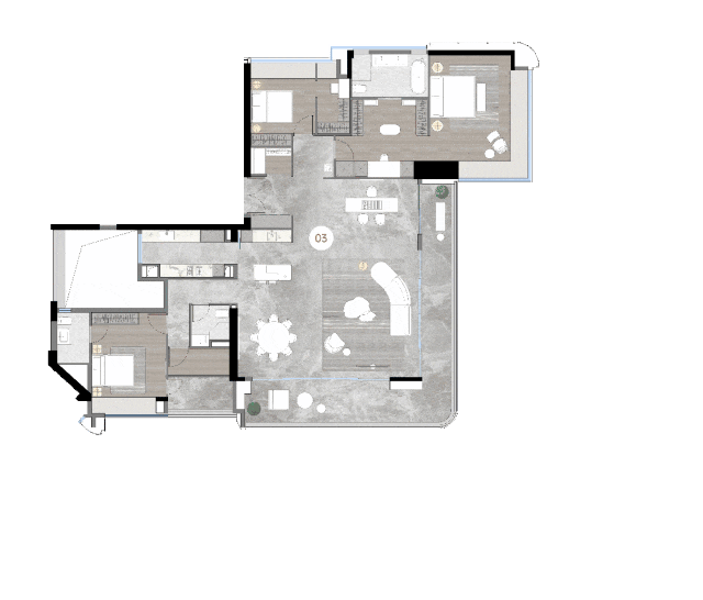:与 248㎡户型布局相似,四开间南向采光,南北通透 LDKB 大通厅,客餐与中西厨一体化。双套房设计,主卧拥有 270° 开阔观江视野,可望江入眠。