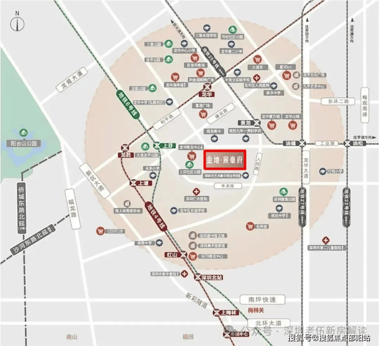 金地启曜,位于龙华区民治街道工业路与龙华人民路交汇处,项目东侧是同期在售的鸿荣源尚云花园,南侧是艺术高中民治学校,北侧是龙华商业中心城市更新单元,4号线“龙华站”距离约1公里,东南侧是龙华最大的商业中心-壹方天地购物中心。