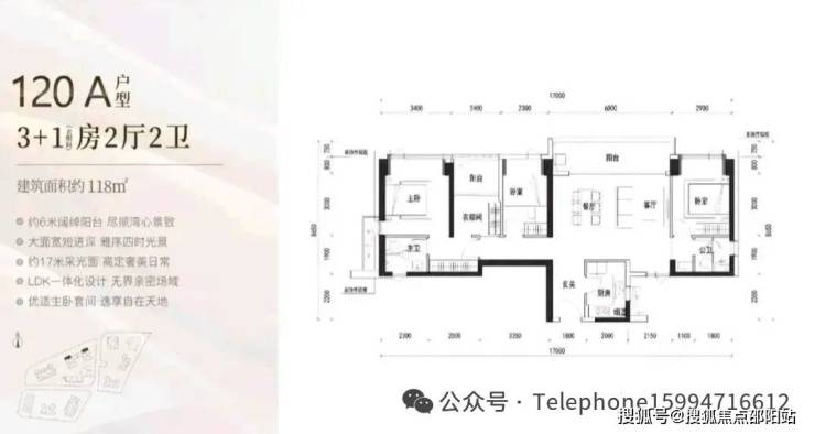 118㎡的4房2厅2卫,A户型(1栋1/2单元01户型),设计的是横厅格局,进门入户玄关,客餐厅6米开间,LDKB一体化设计,4个卧室分别做到了主卧17.65㎡/次卧11.02㎡/次卧9.12㎡/次卧8.74㎡(包含墙体飘窗),客餐厅出6米长的观景大阳台看深大校区,U型厨房,公卫三段式分离,得房率约90%(包含赠送),西北朝向。