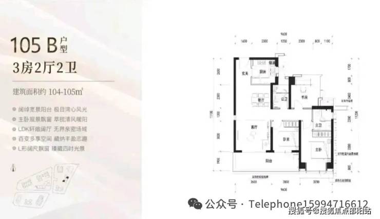 105㎡的3房2厅2卫,B户型(2栋3单元02/06户型),设计的是经典竖厅格局,客厅3.6米开间,LDKB一体化设计,三开间朝南,动静分区,3个卧室分别做到了主卧13.12㎡/次卧9.9㎡/次卧8.4㎡(包含墙体飘窗),客厅连接次卧出6.4米长的宽景大阳台,U型厨房,卫生间干湿分离,得房率约90%(包含赠送),正南或东南朝向。
