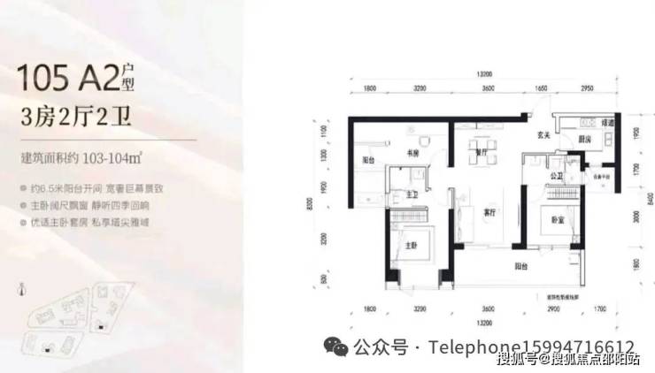 103-104㎡的3房2厅2卫,A2户型(2栋4单元/3栋2单元03户型),设计的是竖厅类双龙抱珠格局,客厅3.6米开间,客餐厅一体化设计,3个卧室分别做到了主卧12.8㎡/次卧12㎡/次卧8.7㎡(包含墙体飘窗),客厅连接次卧出6.5米长的宽景大阳台,U型厨房,公卫三段式分离,得房率约90%(包含赠送),正南朝向。跟A1户型除了朝向不一样,其它都是一致的。