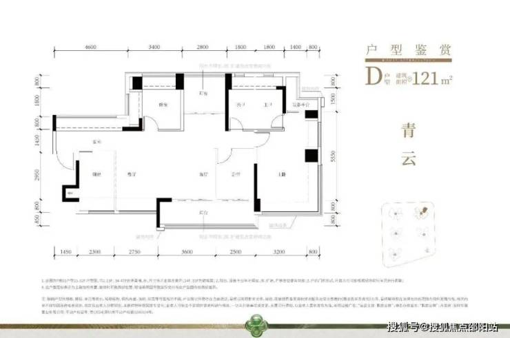 121㎡的4房2厅2卫,设计的是横厅南北通透格局,进门赠送约4.6㎡的入户玄关(不计算在户型图内)