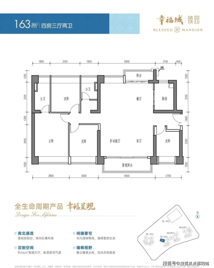 设计的是横厅南北通透格局,进门入户玄关,客厅5.9米开间,餐厨一体化设计,南北双阳台,全屋6个飘窗面,4个卧室分别做到了主卧18.31㎡/次卧12.4㎡/次卧10.15㎡/次卧9.45㎡(包含墙体飘窗),客厅出5.9米长的观景大阳台,U型厨房,公卫三段式分离,得房率约87.1%(包含赠送),阳台主朝东南向。