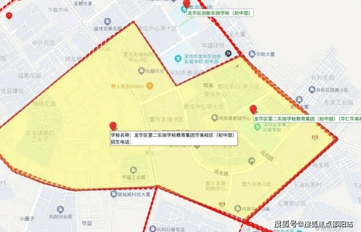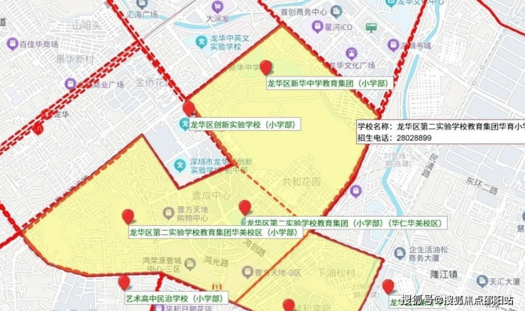 依据2024年龙华区教育局的学区划分方案,小学学区涵盖龙华第二实验学校华美校区、龙华区新华中学教育集团小学部;初中学区为龙华第二实验华美校区。