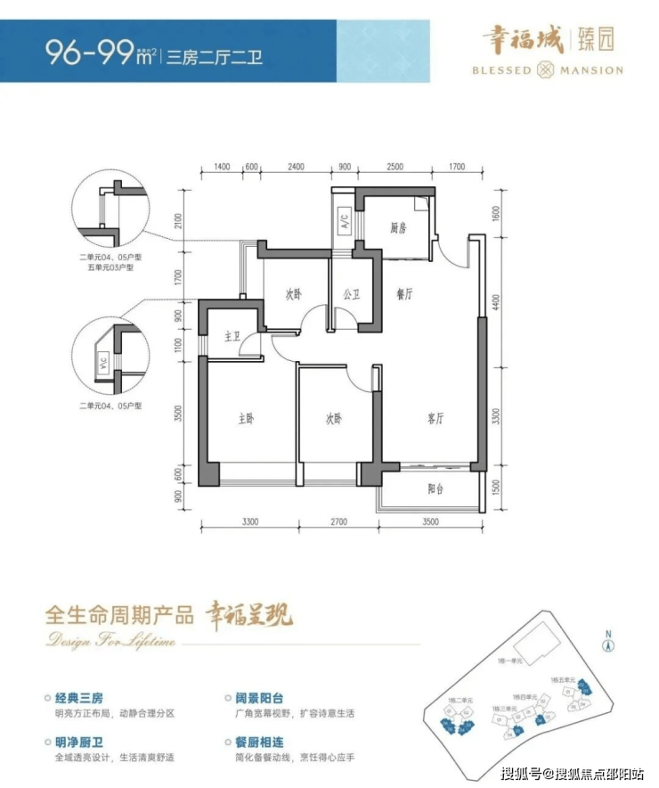面积:96-99㎡三房两厅一卫
